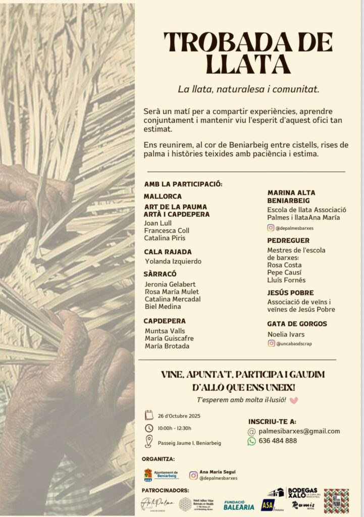 En el marco del encuentro, se presentará oficialmente la asociación “Palmes i Llata”, creada para unificar a los pueblos y artesanos de la Marina Alta y defender la artesanía tradicional vinculada al margalló. Esta asociación invita a todos los interesados a sumarse a una red que busca mantener vivo este patrimonio común y fomentar su transmisión a las nuevas generaciones.