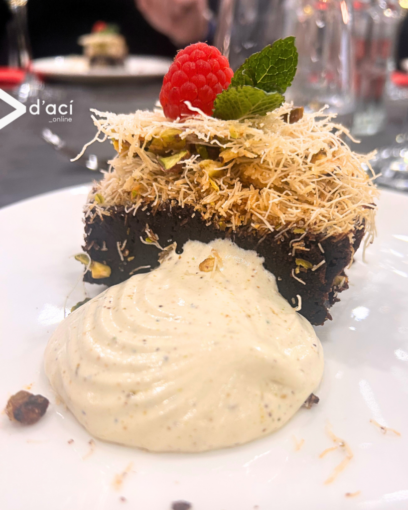 Un brownie intenso, húmedo, con el punto exacto de cocción, acompañado de pistachos tostados y praliné, y coronado con el crujiente kataifi que aportaba textura y contraste.