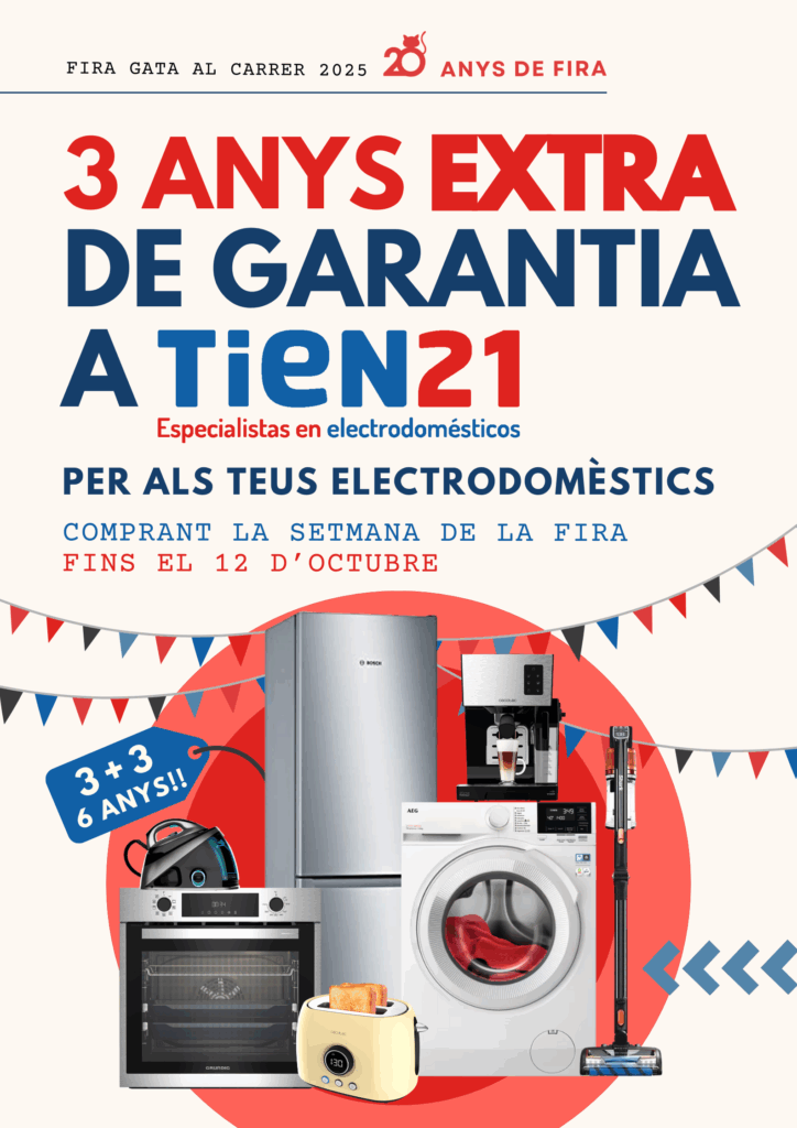 Este año, con motivo de la Fira Gata al Carrer 2025, Tien21 Gata lanza una promoción muy especial: 👉 3 años extra de garantía en tus electrodomésticos por cualquier compra realizada durante la semana de la feria, hasta el 12 de octubre. Esto significa que, sumados a los 3 años habituales, podrás disfrutar de ¡hasta 6 años de garantía en tus productos! Una oportunidad única para renovar tus electrodomésticos con la tranquilidad de saber que estarán cubiertos durante mucho más tiempo.